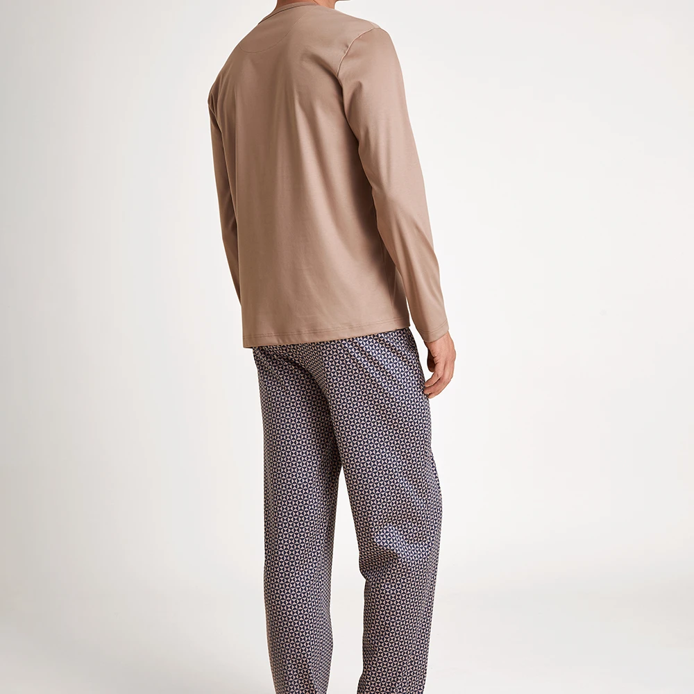 Langer Pyjama für Herren aus der Serie RELAX SELECTED. Das klassische Modell präsentiert sich mit einer gemusterten Hose und einem unifarbenen Longsleeve mit aufgesetzter Brusttasche. Die reine Baumwolle in weicher Interlock-Qualität sorgt für uneingeschränkten Tragekomfort. Der Pyjama kommt verpackt in einem praktischen Wäschebeutel , aus recycletem PET, und spart somit unnötigen Abfall.