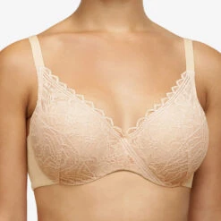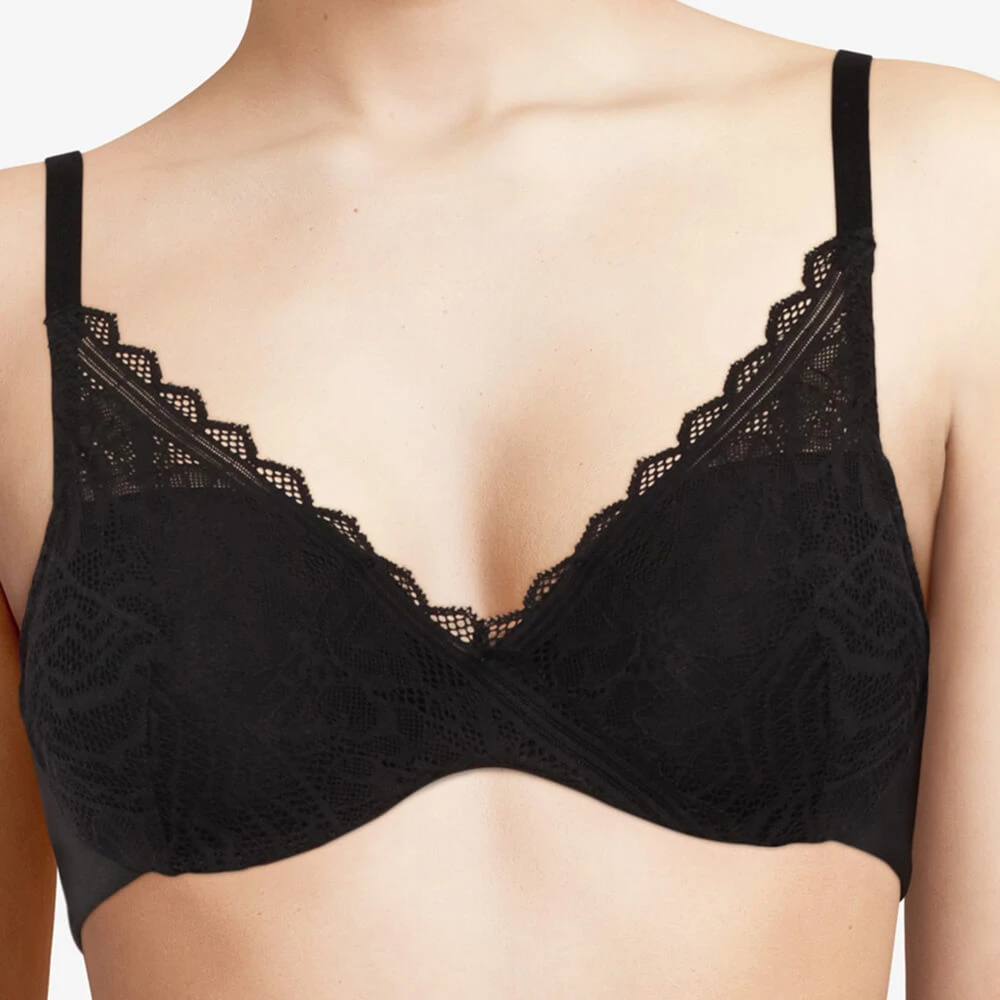 Bedeckender Bügel-BH mit Cups aus Memory-Schaum. Körbchen bedeckt mit sehr weicher floraler Spitze, gekreuzt in der Mitte für einen Wickeleffekt. Formt die Brust sehr leicht, ohne Volumen hinzuzufügen.Â