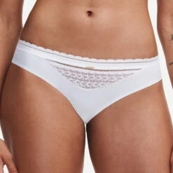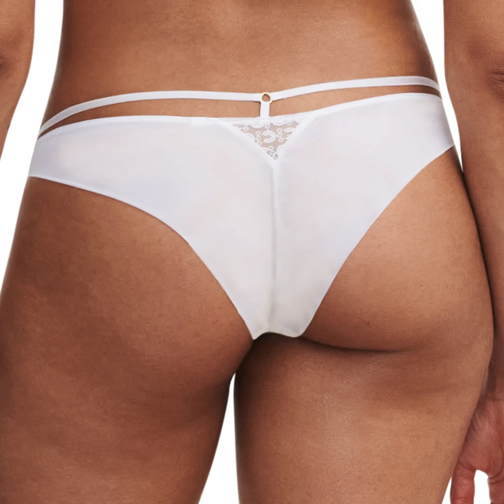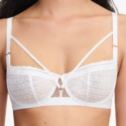 Mittelsteg aus festem Tüll, verziert mit einer goldenen Schmuckelement und einem Spiel von Bändern, die bis zu den Trägern reichen, im Sinne von Bondageelementen.