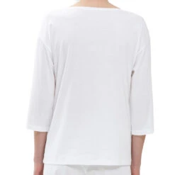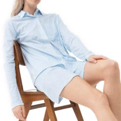 Sleepsation. Alle Styles sind zu 100 % aus Biobaumwolle hergestellt und GOTS-zertifiziert. Das superfeine und klare Warenbild kommt in der Farbe reinweiß besonders edel zur Geltung. Darüber hinaus sind die Kombinationen mit einem hellblauen Streifen ein klassischer Evergreen. Schönes Detail sind die Satin-Taschen aus recyceltem Polyester. Klare und puristische Schnittformen stehen im Vordergrund dieses langlebigen Mix-and-Match-Nachtwäsche-Programms.